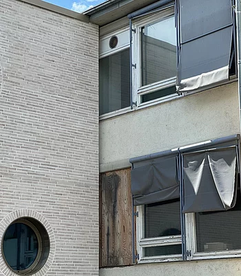 Eine Kombination aus alt und neu… Der Klinker innen wurde erhalten, die Räume sind bereits gestrichen und die neuen Türrahmen gesetzt. Die Räume sind schön groß, der Boden grau. Es fehlen noch die bunten Kinder. Die Lüftungsanlage… eine Reminiszenz an vergangene Zeiten, die an der Decke thront. Der Blick auf das alte Hauptgebäude verrät: Hier steht noch Arbeit an.
