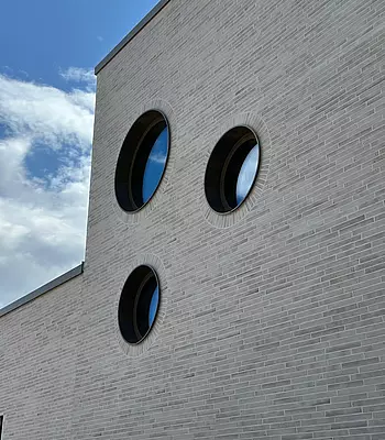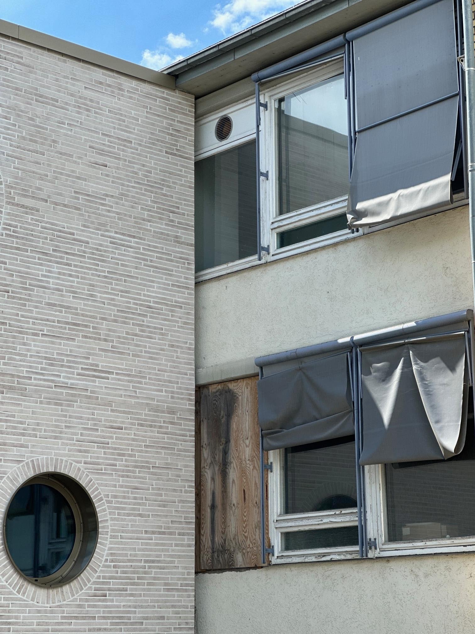 Die Fassade ist der KNALLER! Wunderschöner Klinker vor hellblauem Himmel, dazu runde Fenster: eine tolle Architektenleistung (ohne den blauen Himmel ist es auch schön).