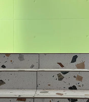 Das Treppenhaus ist so groß! HIer ist keine Quetsch- Passung mehr auf dem Weg zum Klassenraum der vierten Klassen. Der Flur ist breit, die Fliesen bunt und … die Wand grün. Grün ist im Schulgebäude überall zu finden- an Wänden, an der Decke (Mensa!), auf dem Boden (Büro).
