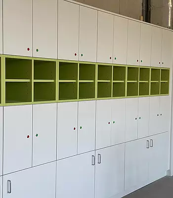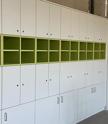 Auf den Fluren wurden die Garderoben befestigt und warten nun auf Turnbeutel und Jacken. Auch ein Mützenfach und Hausschuhfach wurden vorgesehen (UND man kann darunter durchwischen…).