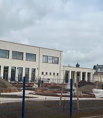 Unser Altbau ist von einem Gerüst umgeben und es wird im Haus schwer (hörbar) gearbeitet. Dort sollen 6 Klassenräume und mehrere Funktionsräume entstehen.