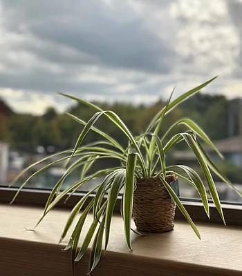 Auf den Fensterbänken haben bereits Pflanzen Einzug gehalten (noch grün).