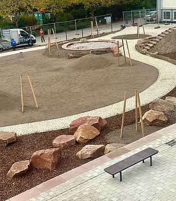 Auf dem Schulhof sieht man die tagtäglichen Veränderungen. Bänke sind aufgebaut worden, der Weg wurde in großen Teilen angelegt und die Rutsche wartet auf die ersten … Kinder natürlich.
