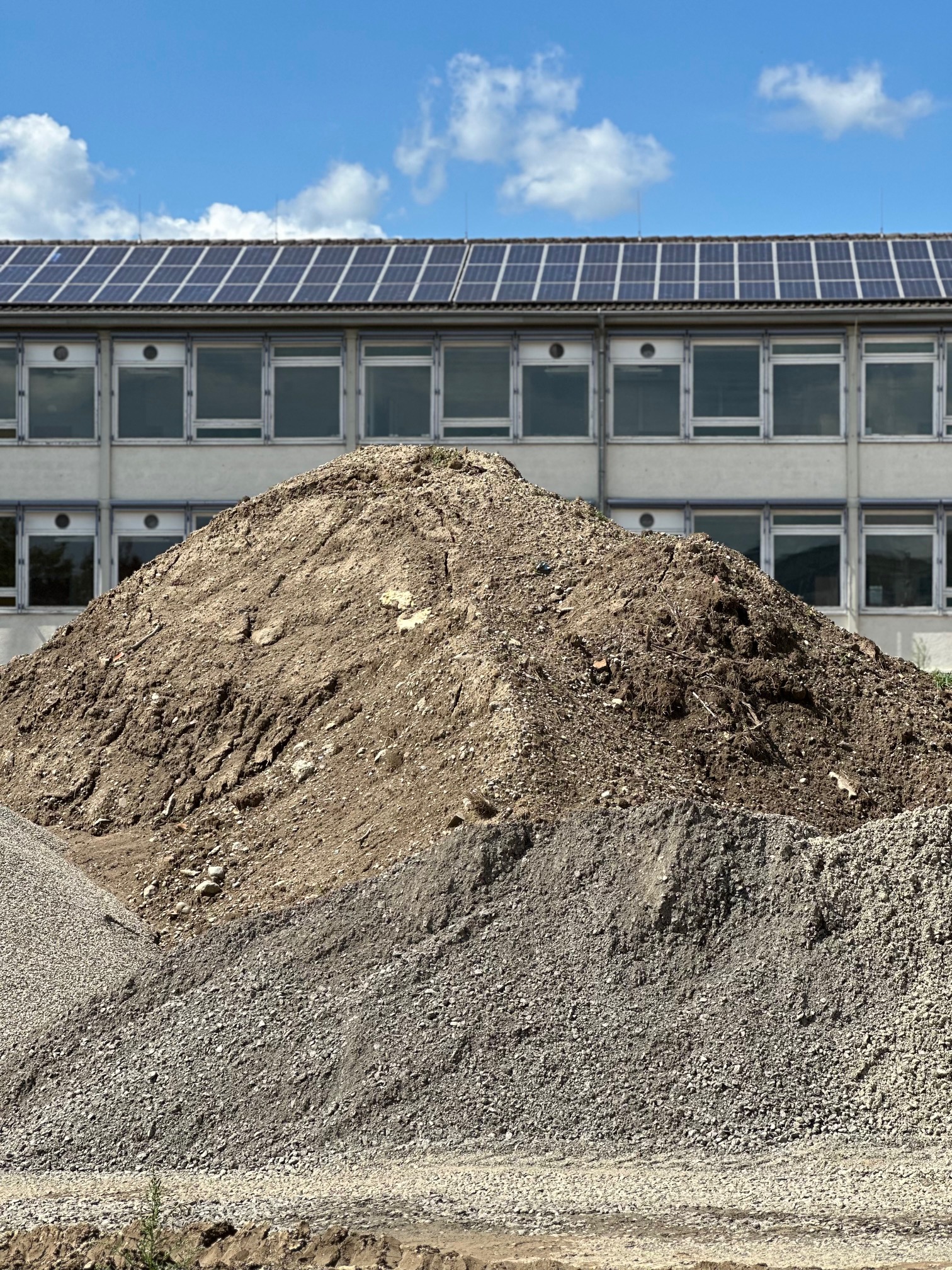 Der Blick aus dem Neubau- Fenster verrät: Der Schulhof wird wunderschön. In 9 Tagen wird hier aber kein Kind sitzen können. Erst im November wird der Schulhof geöffnet werden. Bis dahin… schauen wir beim Arbeiten zu.