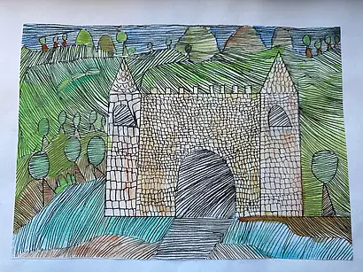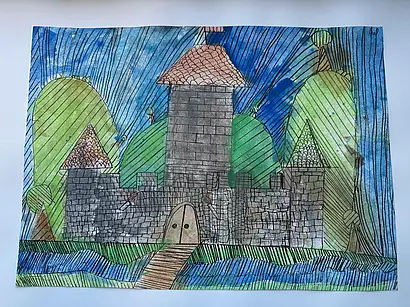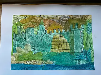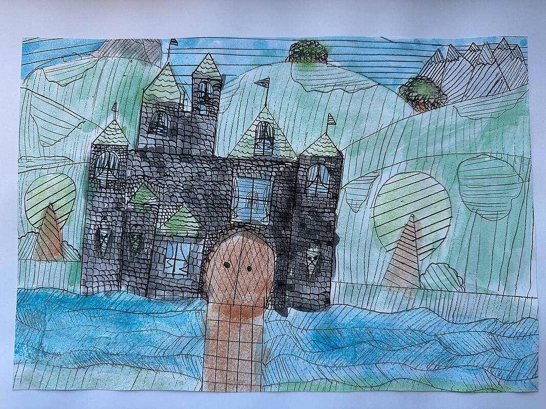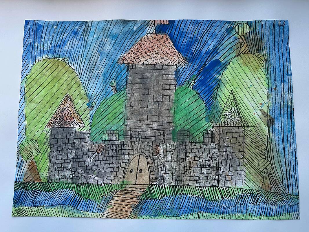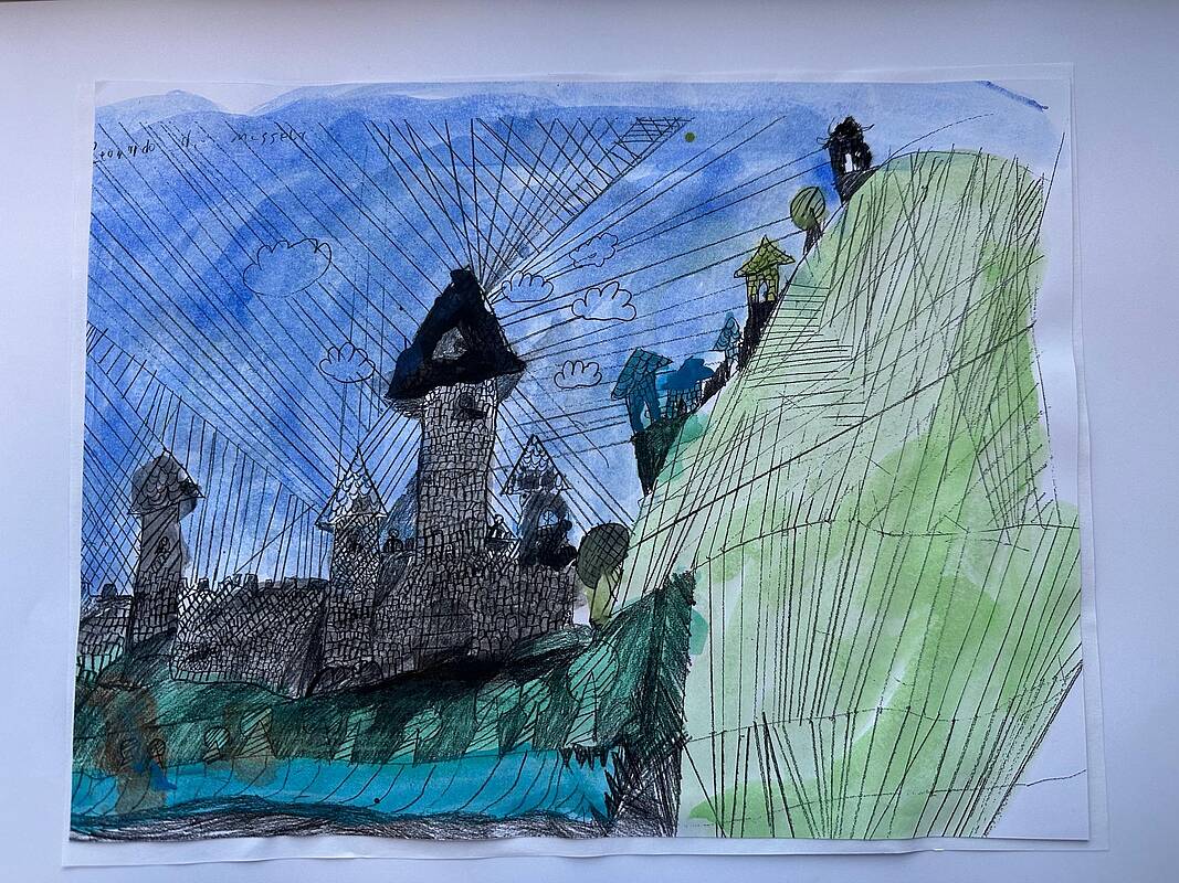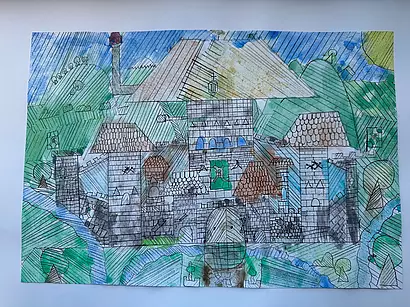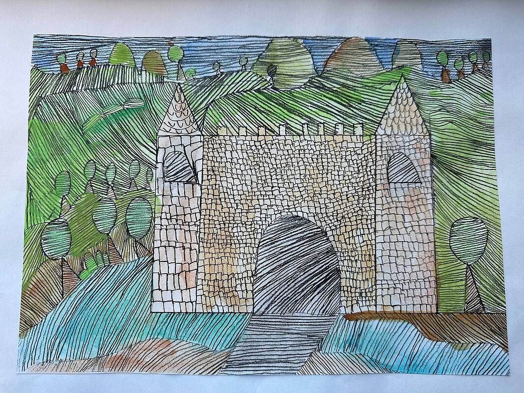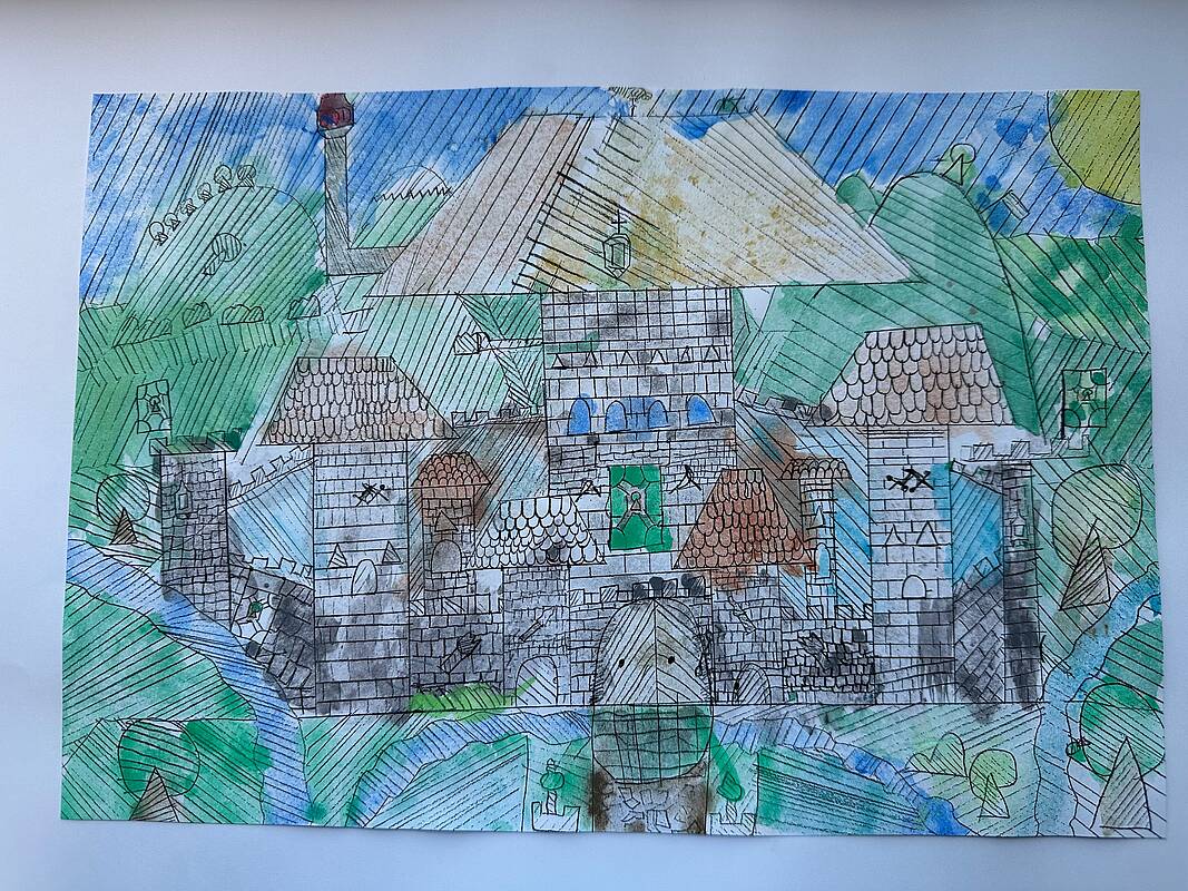 Die vierten Klassen haben kleinteilige und filigrane Bleistiftzeichnungen angefertigt, die im Anschluss in Aquarelltechnik farblich gestaltet wurden.
