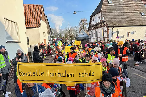 Viele Schüler der Hainbuchenschule nahmen am 18. Januar am Umzug der Hagenbacher Wölfe teil. Es wurde getrommelt und gesungen und aus aktuellem Anlass war auch ein Motto schnell gefunden: Baustelle…
