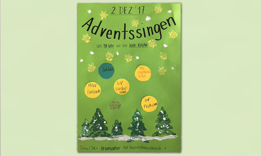 Die Klasse 3 a hat im Kunstunterricht mit Frau Geissler die Plakate für das diesjährige Adventssingen gestaltet. Es wurde gedruckt und jedes einzelne Bild wurde ein Unikat. Es sind sehr sehenswerte Stücke entstanden.