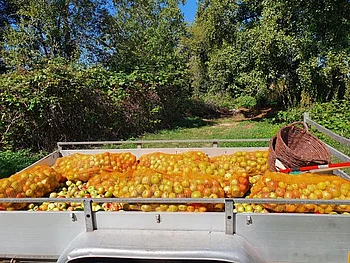 Wir hatten dieses Jahr wieder eine reiche Ernte im Schulgarten. Leider durften wir nicht selbst keltern (Auflage Gesundheitsamt Germersheim) und so organisierte Frau Knöll den Transport unserer Äpfel zu einer Kelterei, die flaschenweise abfüllt.