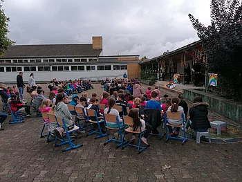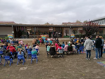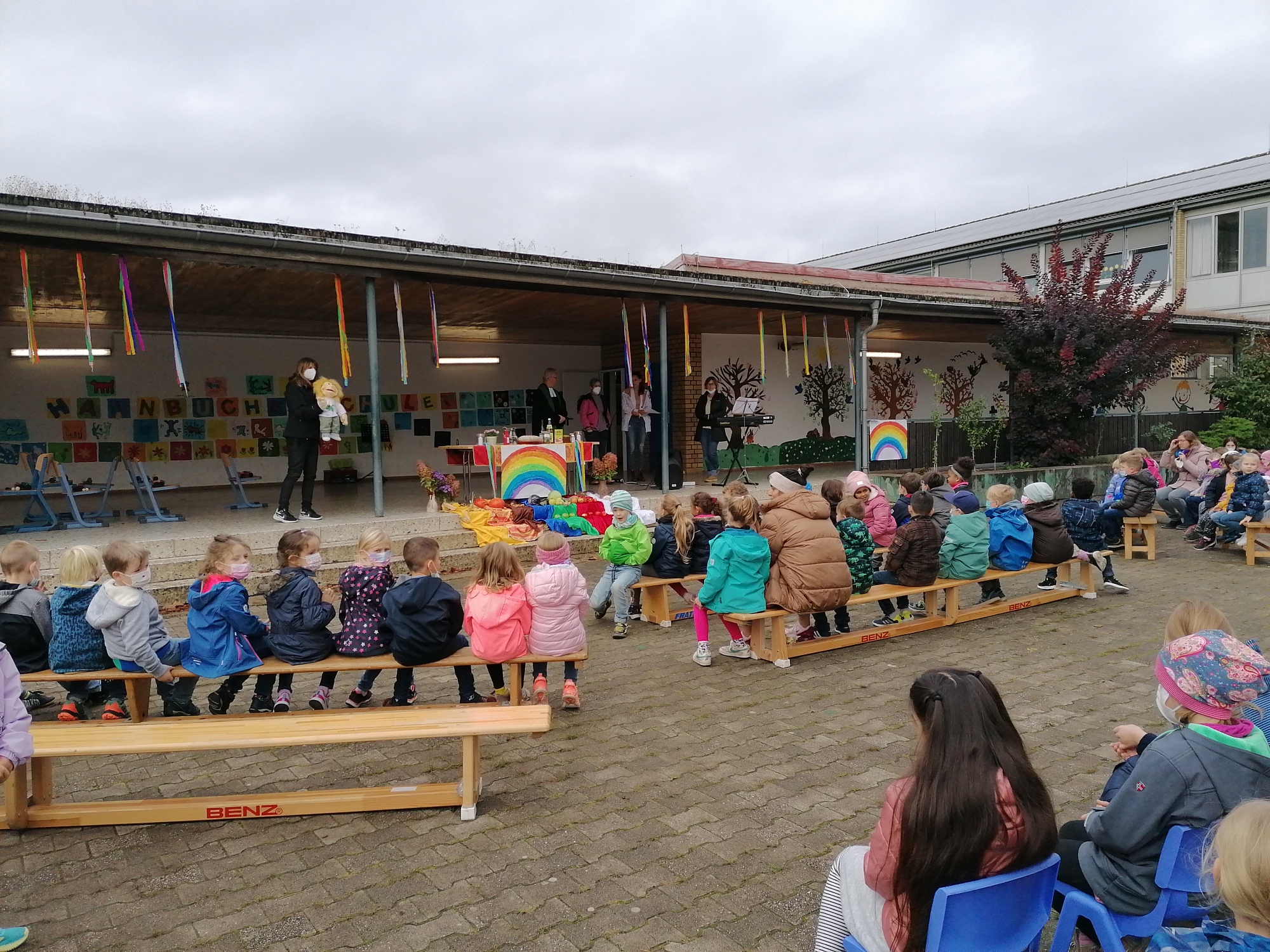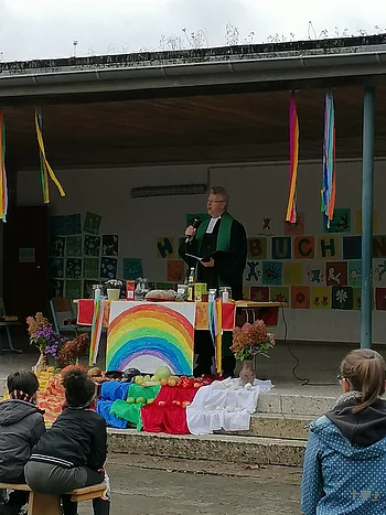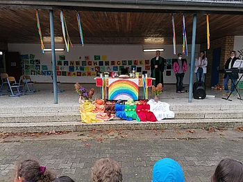 Am Donnerstag feierten wir auf dem Schulhof das Erntedankfest. Herr Pfarrer Pfautsch kam zu unserem Religionslehrerteam dazu und es entstand unter seiner Leitung ein schöner, auf die Kinder ausgerichteter Gottesdienst. Dieser wurde begleitet von den beiden Handpuppen Leon und Leonie, die die Kinder mit auf die Reise zu einem Regenbogen und den Farben nahmen. Herr Pfautsch sprach dazu über Noah und die Arche sowie den Regenbogen. Die Religionslehrer Frau Hilse, Frau Kurz und Frau Rosenberg, gaben sich viel Mühe mit der farbenfrohen Gestaltung. Musikalisch begleitet wurden wir von einer Mama am Keyboard- danke an alle, die sich so viel Mühe gegeben und Zeit für unsere Kinder genommen haben.