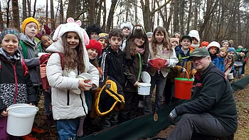 Seit Montag, 24.02.25 sind die Kinder der Hainbuchenschule wieder für den Amphibienschutz unterwegs. Unterstützt durch Herrn Löhle vom Forst werden die Frösche, Lurche und Kröten aus dem Eimer am Schutzzaun umgepackt in kleine Eimer, die die Kinder mitgebracht haben. Im Eimer werden die Frösche dann zum Laichplatz getragen.