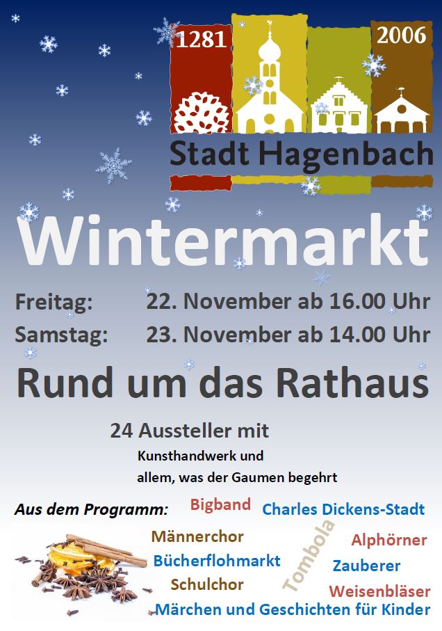 Am 22. und 23. November findet der Hagenbacher Wintermarkt statt. Unser Schulchor steht am Samstag, 23. November von 14:30 - 15:00 Uhr auf der Bühne. Der Förderverein hat seine Unterstützung angezeigt und möchte gerne Waffeln, Apfelpunsch und Kekse anbieten.