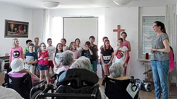 Auch der Chartstürmer „Ich bin doch keine Maschine“ findet nicht nur bei den Kids für Zuspruch. Die Seniorinnen und Senioren waren von dem modernen Popsong sehr begeistert. Bei einigen Seniorinnen / Senioren sangen die Enkelkinder mit, was sie mit sehr viel Stolz erfüllte.