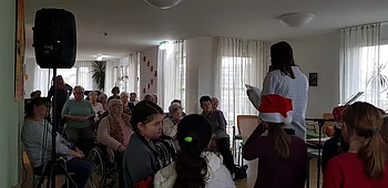 Am Donnerstag, den 13.12. brachten die 20 Kinder der Chor-AG mit ihrer Leiterin, Frau Schlosser, den Seniorinnen und Senioren im ASB-Seniorenzentrum einen musikalischen Winter- und Weihnachtsleckeribissen dar. Gesungen wurde ein Medley aus den Lieblingsliedern der Kinder: "Kling Glöckchen", "Halleluja", "Rudolph, the rednosed raindeer", "Jingle Bells", "In der Weihnachtsbäckerei", "Feliz Navidad" und "Lass jetzt los". Dank der neu angeschafften Musikanlage, die der Förderverein der Grundschule umfangreich unterstützt hatte, konnten alle Zuhörer im Raum den Beitrag der Kinder gut verstehen.