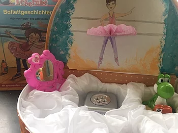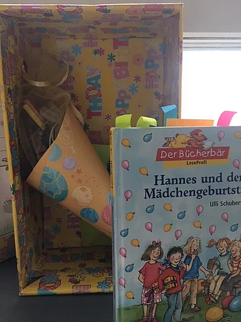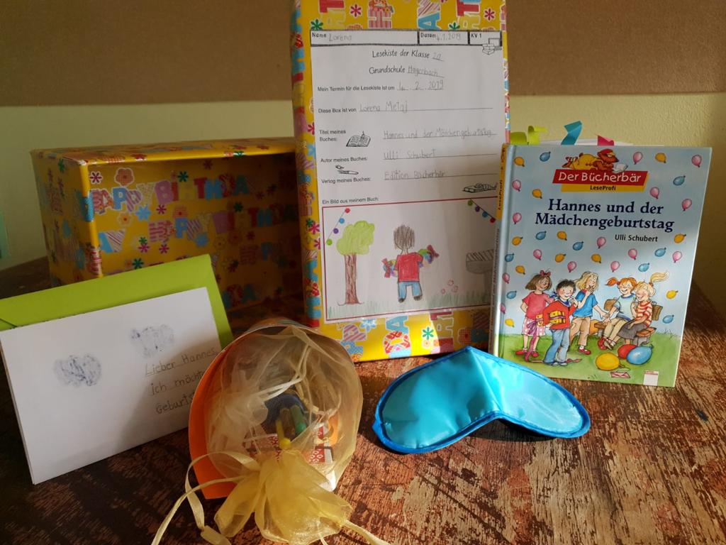 Ich bin Lorena und für meine Lesekiste habe ich mir das Buch Hannes und der Mädchengeburtstag ausgesucht. Ich habe aus meinem Buch vorgelesen und Bilder gezeigt. In meine Kiste habe ich die Dinge gepackt, die Hannes Luisa geschenkt hat.