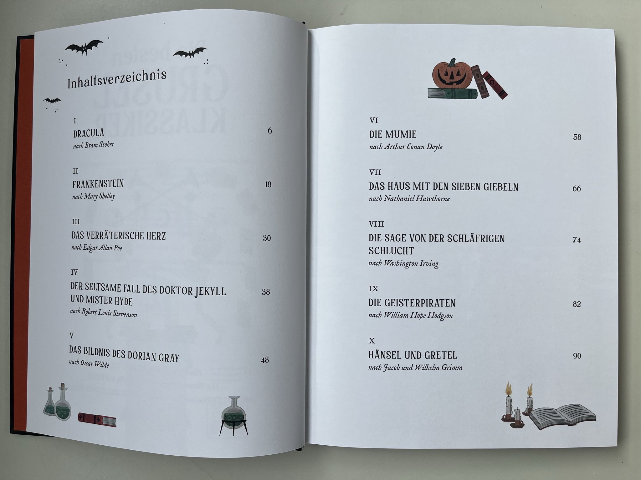 Dieses Buch sammelt die schaurigsten und auch bekanntesten Geschichten rund um das Fürchten und Zähneklappern. Der Ton der Geschichten ist nah am Original und für die Kinderöhrchen aus Klasse 1 und 2 defintiv zu schwere Kost. Unsere “Größeren” werden die verwendeten Wörter nicht alle kennen, der Erzählmodus ist relativ nah am Original. Weder Dracula noch Frankenstein verlieren duch die kindgemäße Erzählweise an Grusekfaktor- Bildung, die unter die Haut geht mit Texten, deren Hauptpersonen zur Allgemeinbildung jedes Gruselfans gehören.