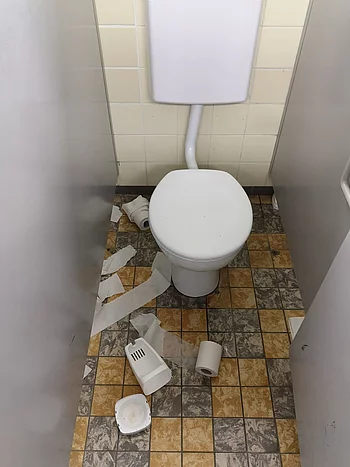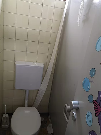 dies sind die Mädchentoiletten, aufgenommen letzte Woche. Wir haben nun seit mehreren Wochen mit diesen Sauereien viel Ärger, großen Bedarf an Klärung und viel viel Mühe, diesen Bereich wieder ordentlich aufzuräumen, sodass tatsächlich auch Kinder auf die Toilette gehen können, wenn sie denn müssen.