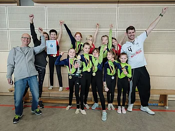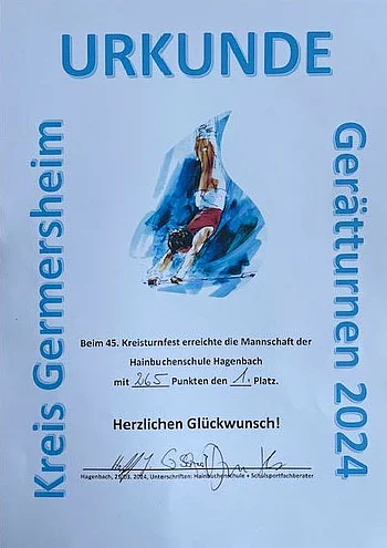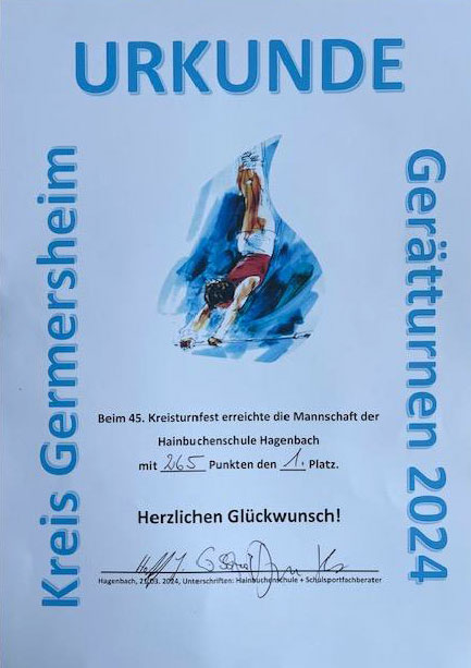 Herr Hartmann, der Sportbeauftragte des Kreises Germersheim, führte souverän am Mikrofon durch den Tag und verkündete am Ende der Veranstaltung das mit Spannung erwartete Endergebnis. Unsere Turnerinnen und Turner hatten mit 2 Punkten Vorsprung den ersten Preis herausgeturnt und die anwesenden Schüler (und Lehrer) jubelten mit den Siegern. Wir sind sehr stolz auf sie!