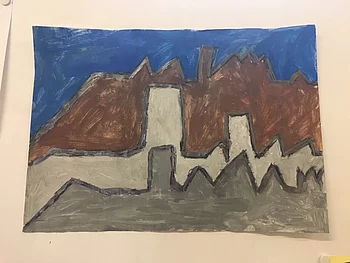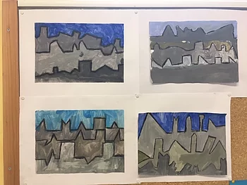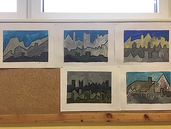 Die Klasse 3b hat Nebelbilder im November gemalt und auf den Fluren aufgehängt.