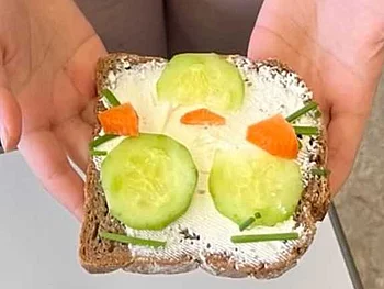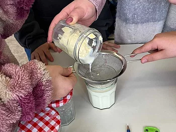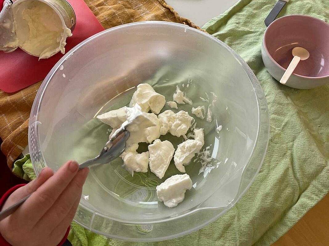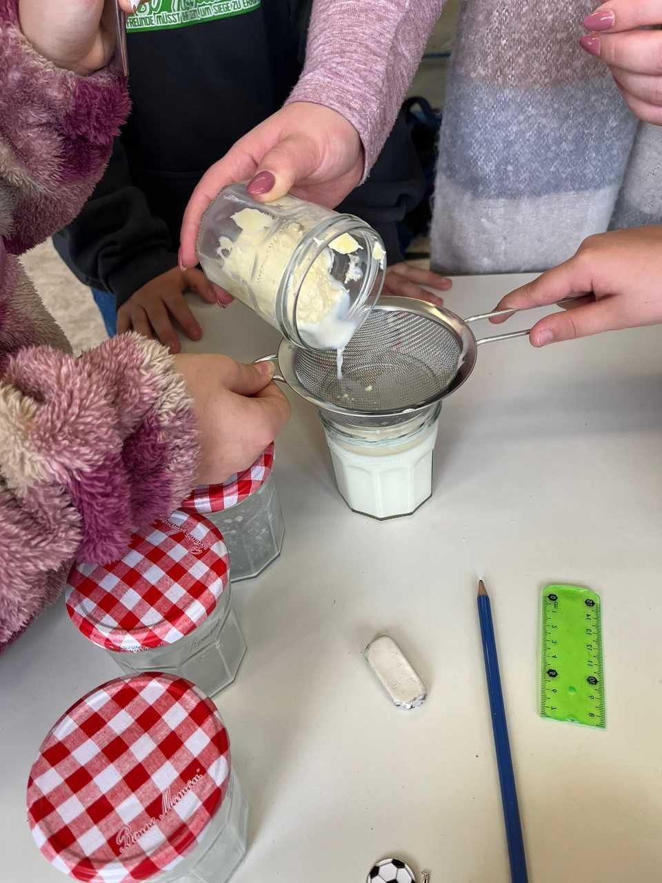 Mit der Ernährungsberaterin Frau Klein haben wir sehr viele lustige Kochexperimente durchgeführt. Aber bevor es zum Kochen kam, haben wir erst Theorie gemacht. Wir haben gelernt auf Hygiene am Arbeitsplatz zu achten und wie wir Obst und Gemüse richtig schälen und schneiden ohne uns dabei zu verletzten – und zwar mit dem Tunnel- und dem Krallengriff. Danach ging es endlich ans Schälen und Schnippeln für die lustigen Brotgesichter mit Frischkäse und Gemüse, die Gemüsesticks mit Quark, den bunten Nudelsalat mit Gouda und den Schlemmerquark mit Obst. Mit Frau Miola haben wir gelernt, wie man selbst Butter herstellen kann. Dafür haben wir Sahne in ein Glas mit Schraubverschluss gegeben und eine ganze Weile fest geschüttelt. Im Glas hat sich eine Butterkugel von der Buttermilch getrennt. Beides durften wir probieren.