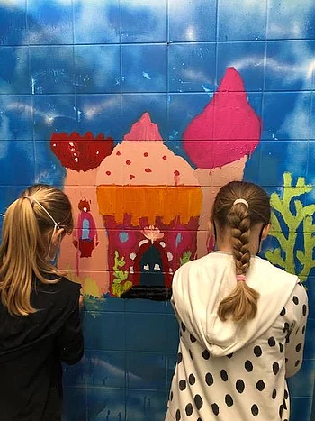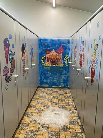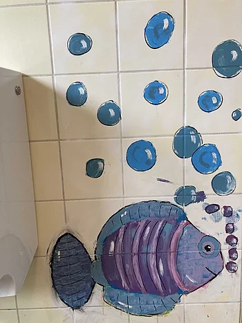 Die Klasse 3b unter fachmännischer Führung von Frau Kurz ist seit Montag (5. Juli2021) in den Toiletten der Kinder zugange: