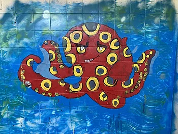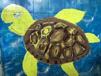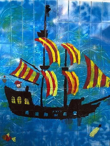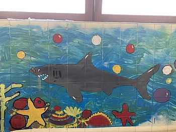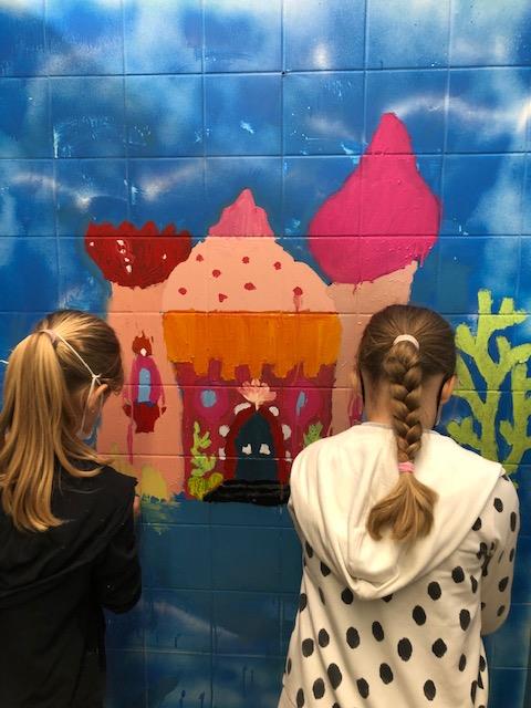 Mit Spraydosen und Lackfarben (alles Dinge, die wir sonst nicht gerne an der Schule sehen) entsteht eine Wasserlandschaft. Piratenschiffe, Piraten, Meerjungfrauen, Fische, Schildkröten und anderes Getier wurden an die Wand gemalt und gesprayt. Die Kinder sind mit Feuereifer und Spaß bei der Sache. Der Förderverein hat die Kosten des Ganzen übernommen, denn mit viel Sorgfalt soll noch ein Mosaik entstehen. Dieses soll noch den Umbau überleben und wird auf eine Trägerplatte geklebt, die auch in den neuen Toiletten (nach dem Umbau) aufgehängt werden kann.