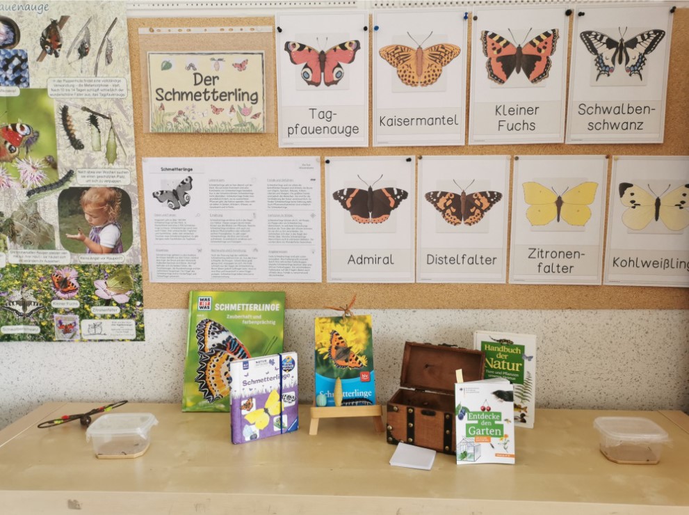Die Klasse 3b mit der Lehrerin Frau Rosenberg züchtet Schmetterlinge. Im Rahmen der der Vorbereitungen zur Umweltwoche entstand die Idee und Frau Rosenberg und die Schüler starteten dirket mit der Umsetzung.