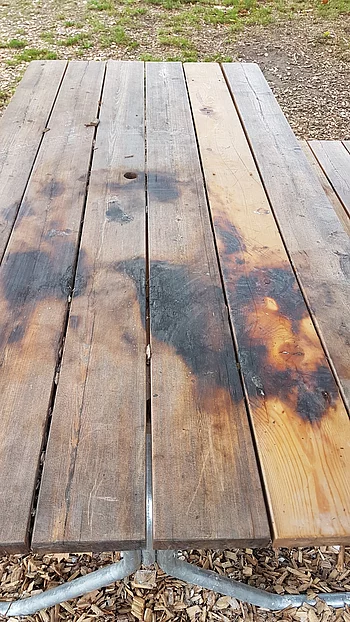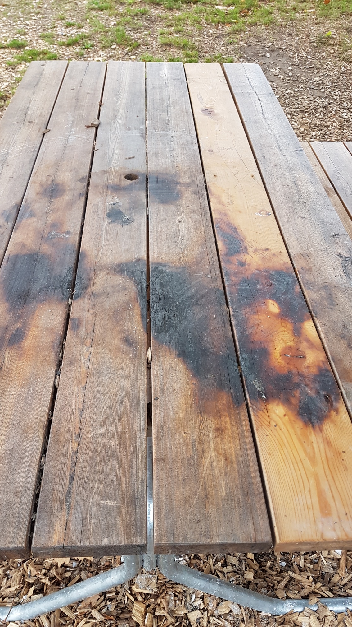 Zudem wurde eine Holzgarnitur (Tisch und Bänke), die erst neu angeschafft und vor wenigen Monaten einbetoniert wurde, angezündet. Neue Bänke, die nun wieder hergerichtet werden müssen.