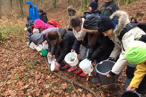 Die Klassen der Hainbuchenschule machen sich seit einigen Tagen auf den Weg, um Fröschen und Lurchen über die Straße in ihr Laichgebiet zu helfen.