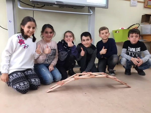 Aurela, Erik, Lilia, Melisa, Philipp und Taha haben es geschafft! Wir haben die Leonardobrücke gebaut. Zwei Versuche wurden benötigt und eine Pause wurde durchgearbeitet, aber dann war es soweit!