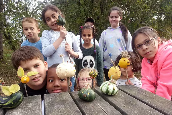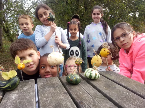 Die Schulgarten- AG hat Kürbisgesichter mit Naturmaterialien gebastelt. Leider können wir sie nirgends ausstellen, da der Zahn der Herbstzeit daran nagt...