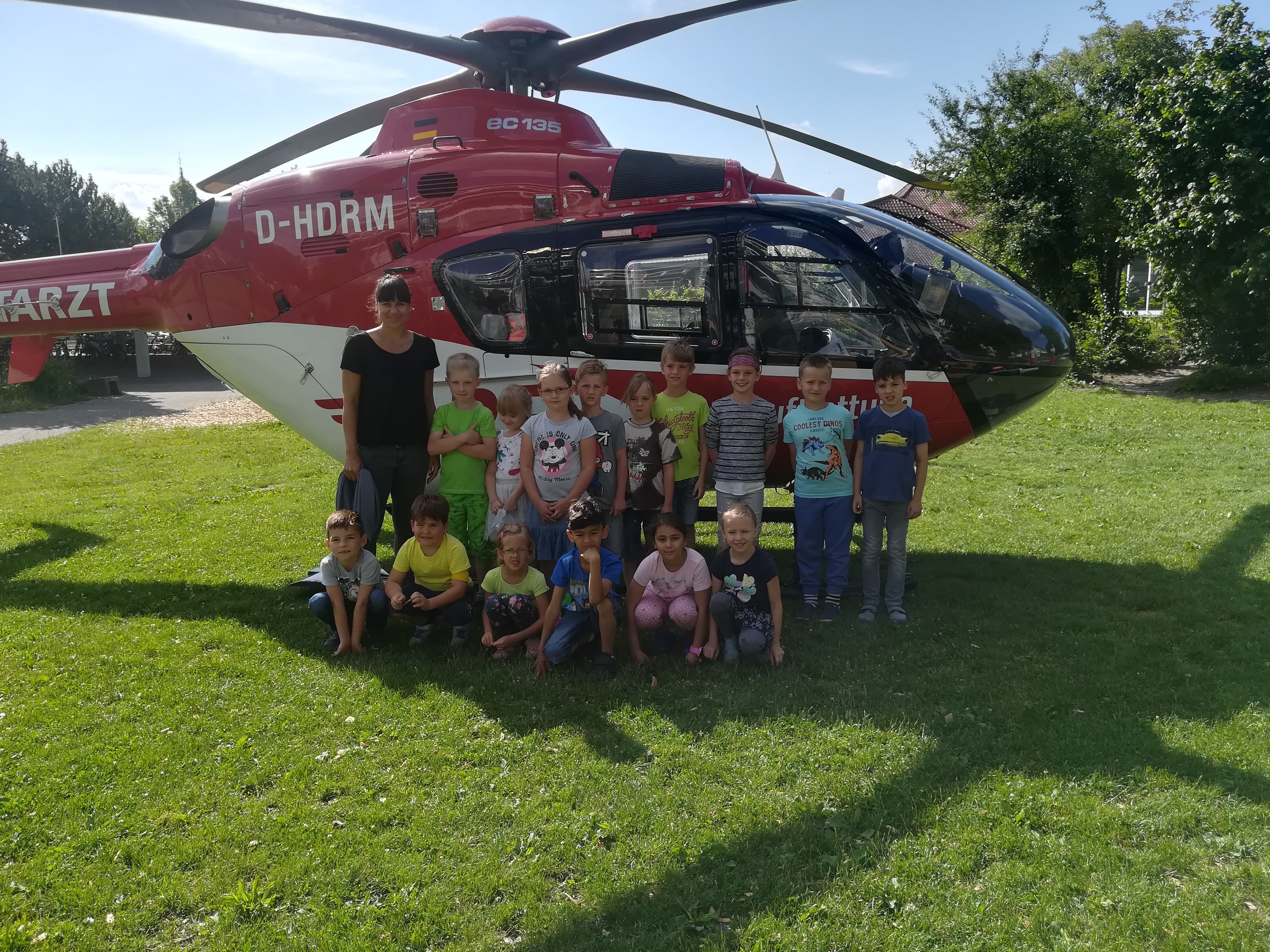 Die Klasse 1c nutzte die Landung eines Rettungshubschraubers auf dem Schulhof der Grundschule, um sich diesen einmal näher anzuschauen. Der Pilot hatte die Erlaubnis gegeben und für die Kinder war es ein echtes Erlebnis. Leider durften weder Schüler noch Lehrer mal eine kleine Runde drehen.