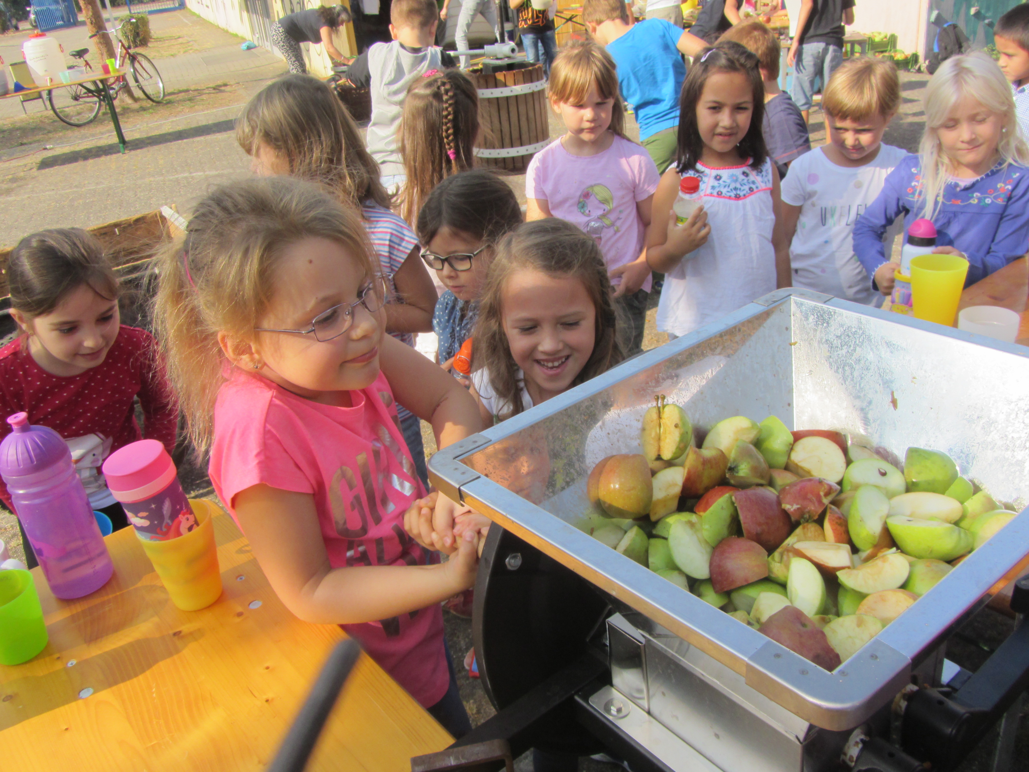 Am Donnerstag, 6.09. war es soweit! Dieses Jahr hängen die Äste unserer Apfelbäume im Schulgarten voll mit Äpfeln und die Kinder konnten sehr früh Apfesaft keltern.