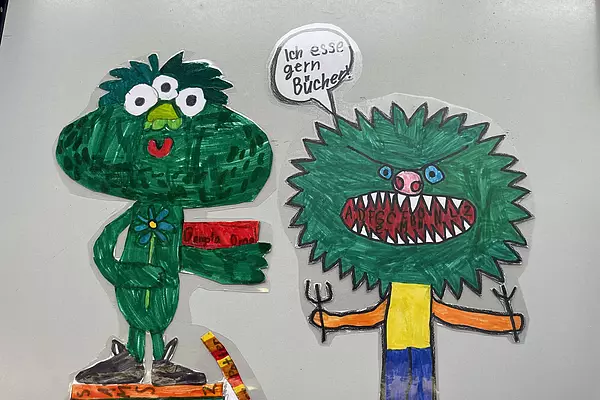 Die Klasse 3a hat Bücherfresser von einer Vorlage abgepaust und mit Hingabe angemalt. Leider durften wir die verfressenen Herrschaften nicht für die Bücherei behalten, sie wurden alle mit nach Hause genommen.
