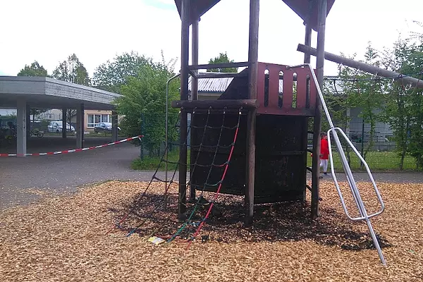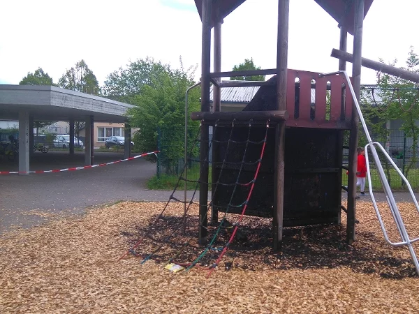 Auf dem Gelände der Schule hat es in der Nacht zum 1. Mai 2017 gebrannt. Das einzige Spielgerüst, das die Kinder der Hainbuchenschule zur Verfügung hatten, wurde angesteckt.