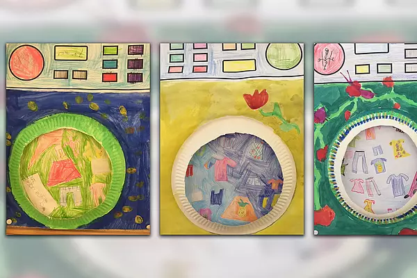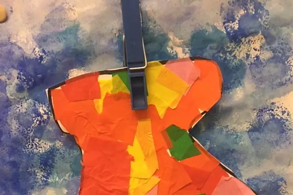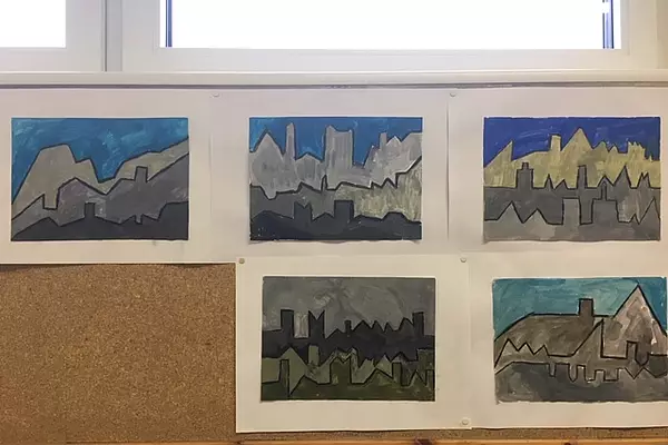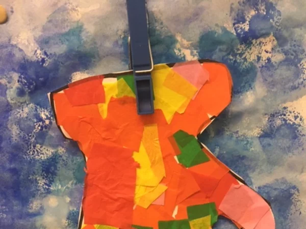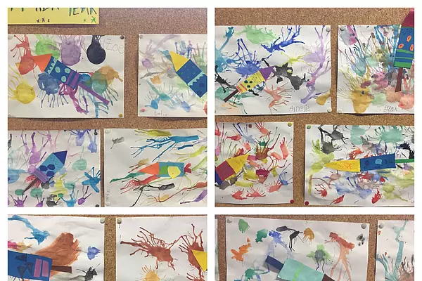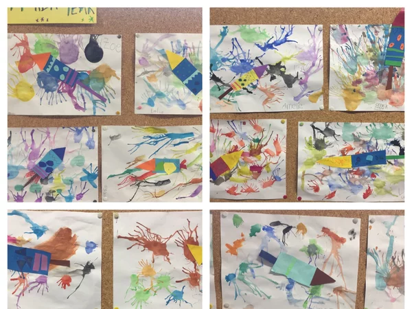 Die zweiten Klassen haben im Kunstunterricht die Handschuhe zum Trocknen auf die Leine gehängt. Schöne Bilder sind dabei entstanden.