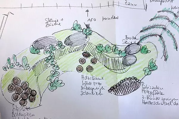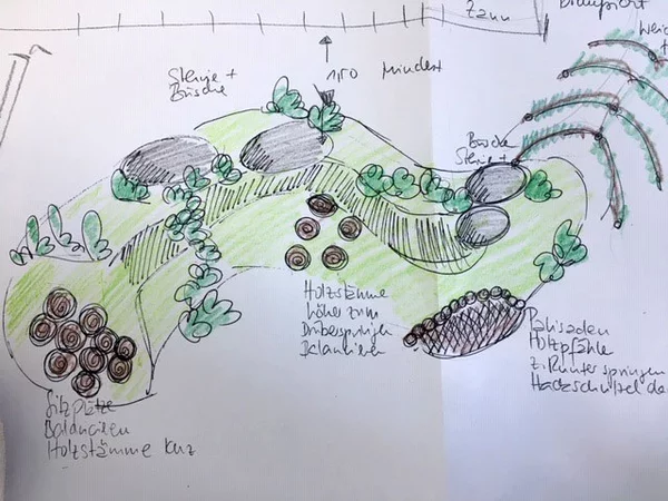 Die ersten Schritte sind getan: Wall mit Bagger zurechtgeschoben, Steine gesetzt, Pflanzen gesetzt, Baumstämme einbetoniert, Palisaden gesetzt, Stämme entrindet (eine besonders angenehme Arbeit), Gras gesät.
